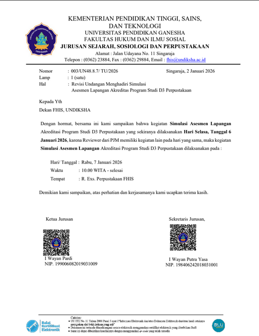 29 Januari 2026 29 Januari 2026Categories Agenda PengumumanUndangan Menghadiri Yudisium Mahasiswa Fakultas Hukum dan Ilmu Sosial Universitas Pendidikan Ganesha Periode Januari Tahun 2026