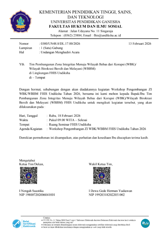 13 Februari 2026 13 Februari 2026Categories AgendaSurat Undangan Menghadiri Acara Workshop Pengembangan ZI WBK-WBBM FHIS Undiksha Tahun 2026