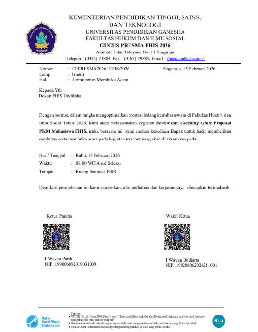 16 Februari 2026 16 Februari 2026Categories AgendaPermohonan Membuka Acara Review dan Coaching Clinic Proposal PKM Mahasiswa FHIS Undiksha