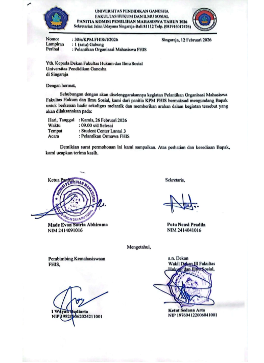 12 Februari 2026 12 Februari 2026Categories AgendaUndangan Pelantikan Organisasi Mahasiswa FHIS Undiksha sekaligus Memberikan Sambutan