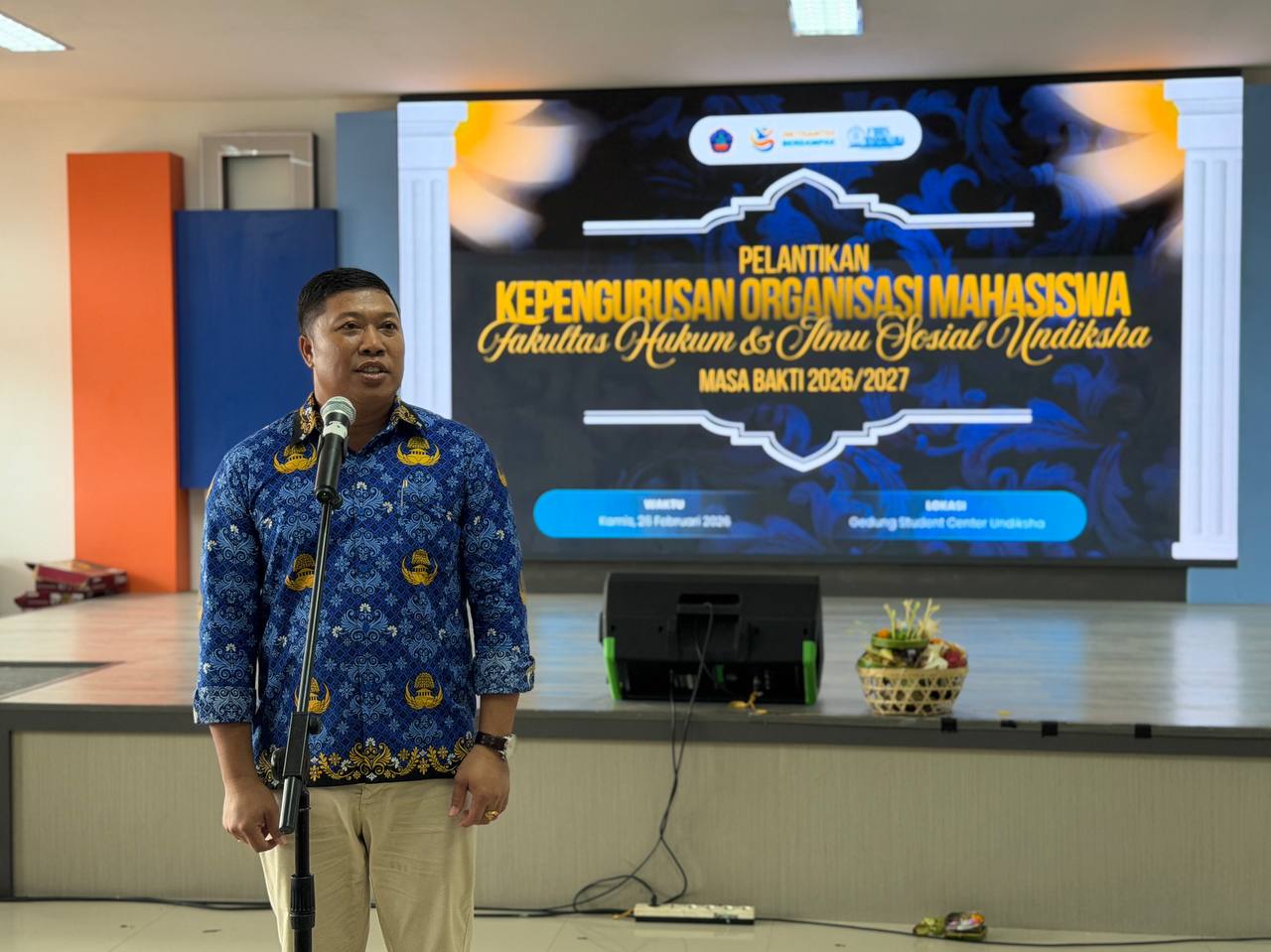 Singaraja – Dekan Fakultas Hukum dan Ilmu Sosial (FHIS) Universitas Pendidikan Ganesha (Undiksha) secara resmi melantik organisasi mahasiswa di lingkungan FHIS Undiksha pada hari Kamis (26/02/2026) di Ruang Student Center Lantai 3 Undiksha. Adapun kepengurusan organisasi mahasiswa yang dilantik, yaitu Badan Eksekutif Mahasiswa (BEM), Dewan Perwakilan Mahasiswa (DPM), Himpunan Mahasiswa Jurusan (HMJ) Hukum dan Kewarganegaraan, Himpunan Mahasiswa Jurusan (HMJ) Geografi serta Himpunan Mahasiswa Jurusan (HMJ) Sejarah, Sosiologi dan Perpustakaan. Kegiatan pelantikan organisasi mahasiswa ini dikoordinir langsung oleh Komisi Pemilihan Mahasiswa (KPM) FHIS Undiksha.