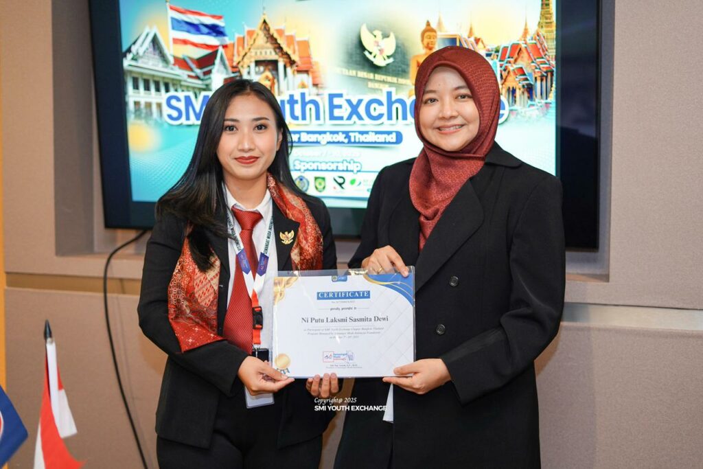 Ni Putu Laksmi Sasmita Dewi, mahasiswa semester 7 Program Studi Ilmu Hukum Universitas Pendidikan Ganesha (Undiksha), berhasil menyelesaikan Program SMI Youth Exchange #11 Chapter Bangkok-Thailand sebagai delegasi fully funded. Program ini diselenggarakan oleh Organisasi Semangat Muda Indonesia (SMI) dan bertujuan untuk memberikan pengalaman serta wawasan global kepada pelajar, mahasiswa, dan masyarakat umum melalui pengenalan lintas budaya, pendidikan, dan isu sosial.