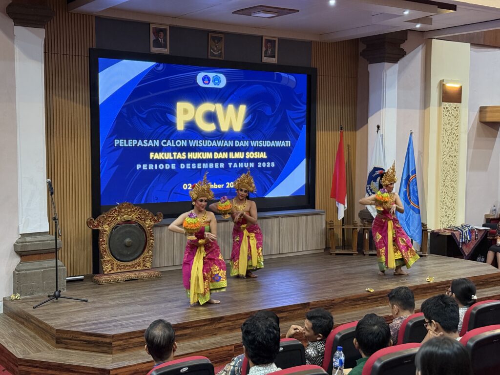 Acara Pelepasan Calon Wisudawan dan Wisudawati FHIS Undiksha Periode Bulan Desember Tahun 2025 dimulai dengan Tari Pembukaan dan menyanyikan Lagu Indonesia Raya serta Mars Undiksha. Setelah itu, selaku Ketua Panitia Pelepasan Calon Wisudawan dan Wisudawati FHIS Undiksha Periode Bulan Desember Tahun 2025, Kadek Budi Arta menyampaikan Laporan Kepanitiaan dalam kegiatan tersebut.