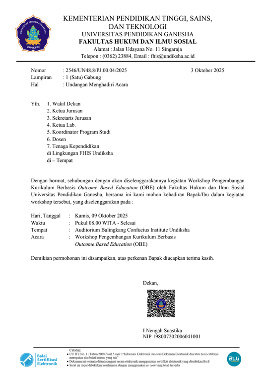 3 Oktober 2025 3 Oktober 2025Categories AgendaWorkshop PengembanganKurikulum Berbasis Outcome Based Education (OBE) oleh Fakultas Hukum dan Ilmu SosialUniversitas Pendidikan Ganesha,