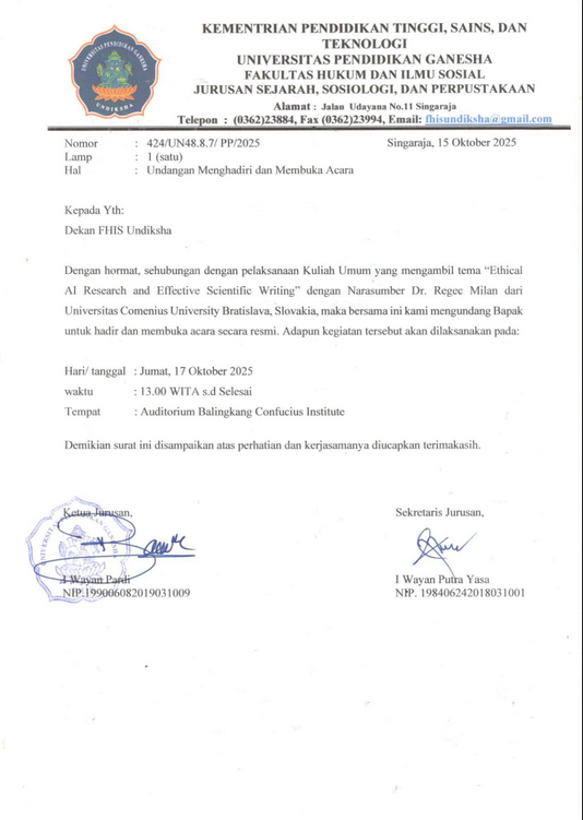 15 Oktober 2025 15 Oktober 2025Categories AgendaKuliah Umum “Ethical Al Research and Effective Scientife Writing” Jurusan SSP FHIS Undiksha