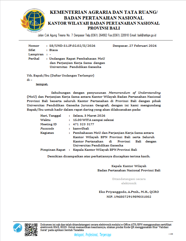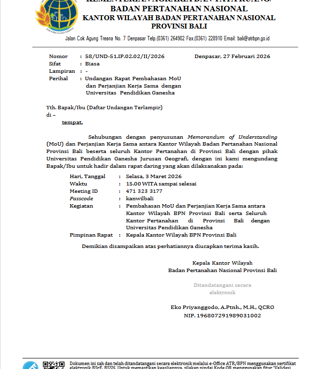 28 Februari 2026 28 Februari 2026Categories AgendaMemorandum of Understanding(MoU) dan Perjanjian Kerja Sama antara Kantor Wilayah Badan Pertanahan NasionalProvinsi Bal