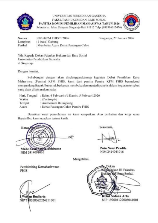 2 Februari 2026 2 Februari 2026Categories AgendaMemberi Sambutan dan Membuka Acara Debat Pemilihan Raya Organisasi Mahasiswa (Pemira) di Lingkungan FHIS Undiksha