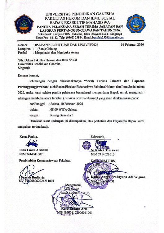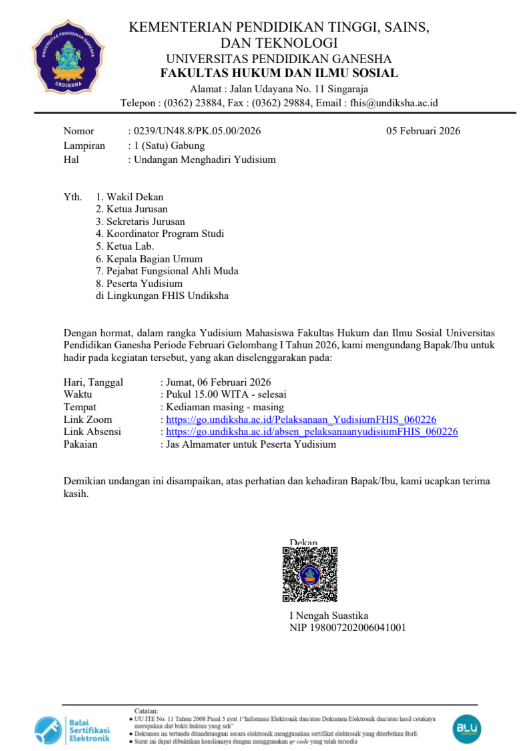 5 Februari 2026 5 Februari 2026Categories Agenda PengumumanSurat Undangan Menghadiri Yudisium FHIS Undiksha Periode Februari Gelombang I 2026