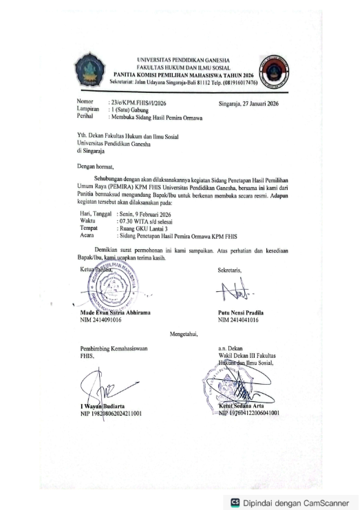 2 Februari 2026 2 Februari 2026Categories AgendaMembuka Acara Sidang Penetapan Hasil Pemira Ormawa FHIS Undiksha