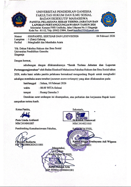 4 Februari 2026 4 Februari 2026Categories AgendaMenghadiri dan Membuka Acara Serah Terima Jabatan dan Laporan Pertanggungjawaban BEM FHIS Undiksha
