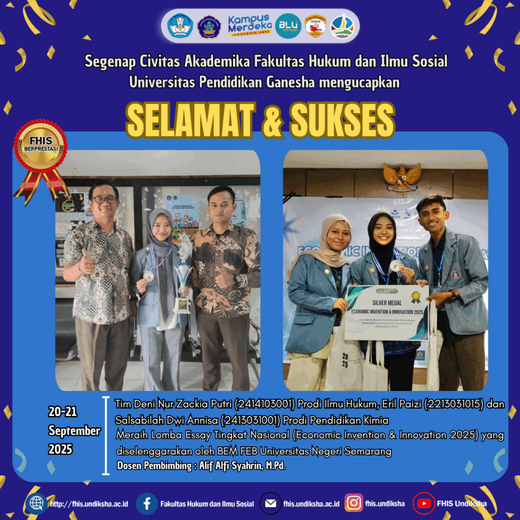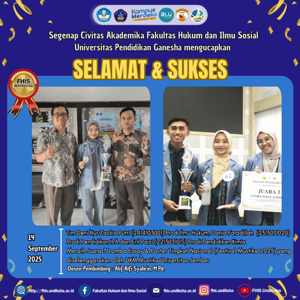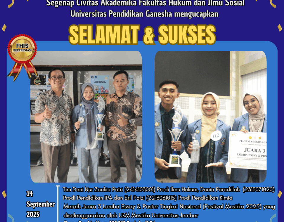Jember – Mahasiswa Fakultas Hukum dan Ilmu Sosial Undiksha meraih prestasi dalam ajang Lomba Essay & Poster Tingkat Nasional (Festival […]