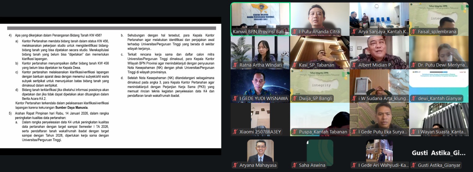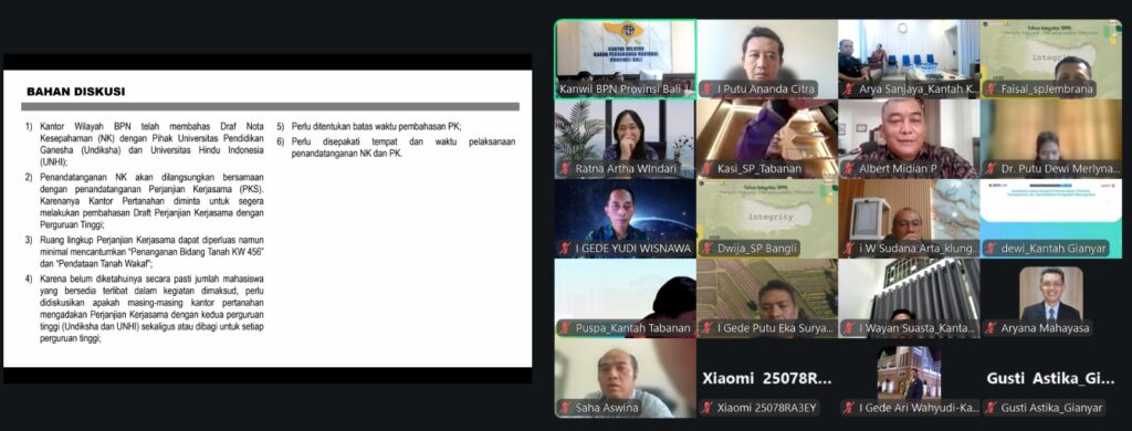 Singaraja – Menindaklanjuti rapat yang telah dilaksanakan sebelumnya, Universitas Pendidikan Ganesha (Undiksha) khususnya Jurusan Geografi Fakultas Hukum dan Ilmu Sosial (FHIS) kembali melaksanakan Rapat bersama Badan Pertanahan Nasional (BPN) Provinsi Bali serta Kantor Pertanahan Kabupaten di Provinsi Bali pada hari Selasa (07/04/2026). Rapat yang dilaksanakan secara daring ini membahas tentang Tindak Lanjut Nota Kesepahaman dengan Penyusunan Perjanjian Kerjasama (PKS) antara Kantor Pertanahan dengan Perguruan Tinggi. Selain itu, rapat ini juga menjadi wadah koordinasi untuk menentukan waktu dan tempat pelaksanaan penandatanganan Nota Kesepahaman.
