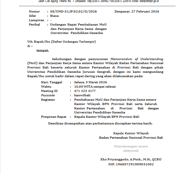 28 Februari 2026 Categories Agenda Tags 2 Undangan Rapat Pembahasan MoU dan Perjanjian Kerja Sama dengan Universitas Pendidikan Ganesha Provinsi BaliUnduh Share Related posts2 April 2026Workshop Kurikulum oleh FakultasHukum dan Ilmu Sosial Universitas Pendidikan GaneshaRead more23 Maret 2026OFFICIAL ANNOUNCEMENT-CALL FOR PAPERS-Read more10 Maret 2026Yudisium Mahasiswa Fakultas Hukum dan Ilmu Sosial UniversitasPendidikan Ganesha Periode Maret Gelombang II Tahun 2026Read more9 Maret 2026Kuliah Umum dengan tema, “PenguatanKesadaran Kebangsaan Mahasiswa FHIS Undiksha”Read more