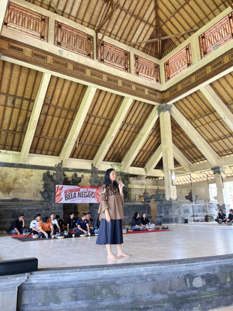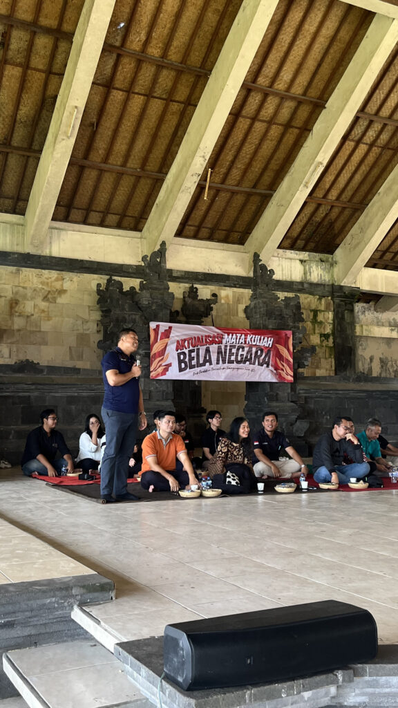 Kegiatan Aktualisasi Mata Kuliah Bela Negara diimplementasikan melalui serangkaian kegiatan seperti Seminar yang berkaitan dengan Etika dan Moral Mahasiswa, Peran mahasiswa dalam menghadapi tantangan global serta Kepemimpinan Manajemen dan Organisasi. Seminar ini didampingi oleh Narasumber, yaitu Dr. Irene Camelyn Sinaga, AP., M.Pd. selaku Direktur Pengkajian Implementasi PIP BPIP dan Drs. Gede Suyasa M.Pd. selaku Sekretaris Daerah Kabupaten Buleleng. Selanjutnya acara Aktualisasi Mata Kuliah Bela Negara diisi dengan Outbound dan acara keakraban lainnya.