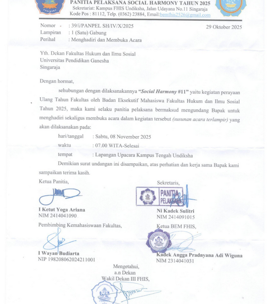 1 November 2025 Categories Agenda Tags 3_Menghadiri dan Membuka Acara Pembukaan Social Harmony #11 (Jalan Santai)Unduh Share Related posts13 November 2025“Social Harmony #11”Read more1 November 2025Focus Group Discussion dengan tema,“Integritas dan Tanggung Jawab sebagai Pilar Utama Pelayanan Akademik” oleh Fakultas Hukumdan Ilmu Sosial Undiksha,Read more1 November 2025Kuliah Umum Dosen Praktisi Jurusan Hukum dan Kewarganegaraan, Fakultas Hukum dan Ilmu Sosial, Universitas Pendidikan GaneshaRead more30 Oktober 2025Yudisium Mahasiswa Fakultas Hukum dan Ilmu Sosial UniversitasPendidikan Ganesha Periode Oktober Tahun 2025Read more