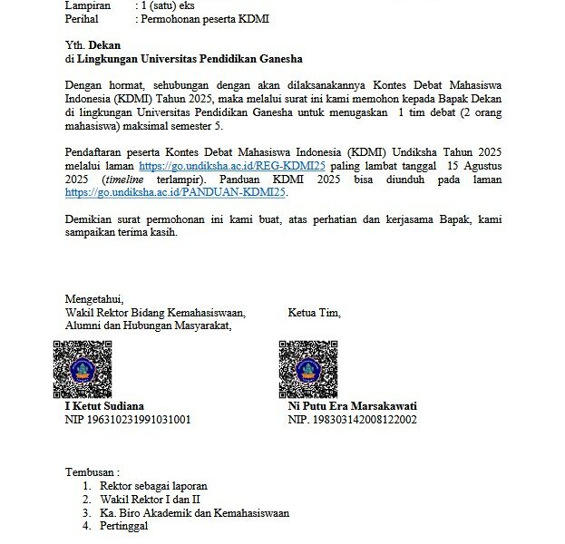 7 Agustus 2025 Categories Agenda Tags 12 Permohonan Peserta KDMIUnduh Share Related posts27 Agustus 2025Menghadiri Sekaligus Membuka AcaraRead more19 Agustus 2025Undangan Rapat Pembahasan Kerja Sama dan Implementation Agreement Undiksha BaliRead more18 Agustus 2025Undangan sebagai Peserta Pemilihan Remaja Berbudi Pekerti XXIRead more13 Agustus 2025Revisi Undangan Evaluasi dan Finalisasi Borang Akreditasi Prodi D3 PerpustakaanRead more