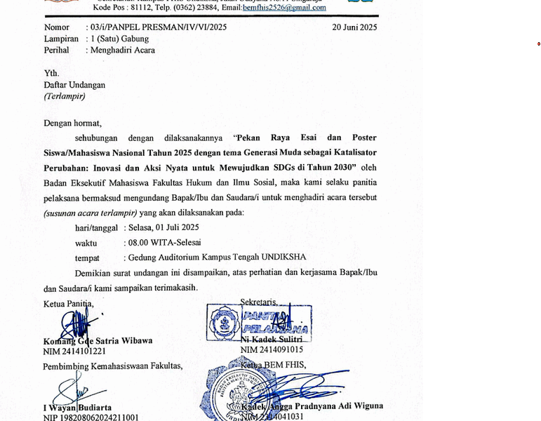 20 Juni 2025 Categories Agenda Tags 2 Surat Undangan Pembukaan PRESMAN DosenUnduh Share Related posts27 Agustus 2025Menghadiri Sekaligus Membuka AcaraRead more19 Agustus 2025Undangan Rapat Pembahasan Kerja Sama dan Implementation Agreement Undiksha BaliRead more18 Agustus 2025Undangan sebagai Peserta Pemilihan Remaja Berbudi Pekerti XXIRead more13 Agustus 2025Revisi Undangan Evaluasi dan Finalisasi Borang Akreditasi Prodi D3 PerpustakaanRead more