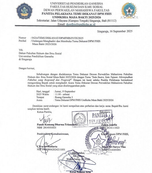 16 September 2025 Categories Agenda Pengumuman Tags 4_Undangan Menghadiri dan Membuka Temu Dekanat DPM FHIS Masa Bakti 2025-2026Unduh Share Related posts24 September 2025Pengabdian Kepada Masyarakat skema MahasiswaBerdampak: Pemberdayaan Masyarakat oleh Badan Eksekutif Mahasiswa Tahun 2025Read more3 September 2025Seleksi Beasiswa Bank Indonesia Tahun 2025Read more27 Agustus 2025Menghadiri Sekaligus Membuka AcaraRead more19 Agustus 2025Undangan Rapat Pembahasan Kerja Sama dan Implementation Agreement Undiksha BaliRead more