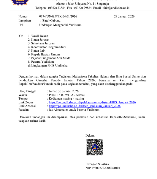 Undangan Menghadiri Yudisium Mahasiswa Fakultas Hukum dan Ilmu Sosial Universitas Pendidikan Ganesha Periode Januari Tahun 2026