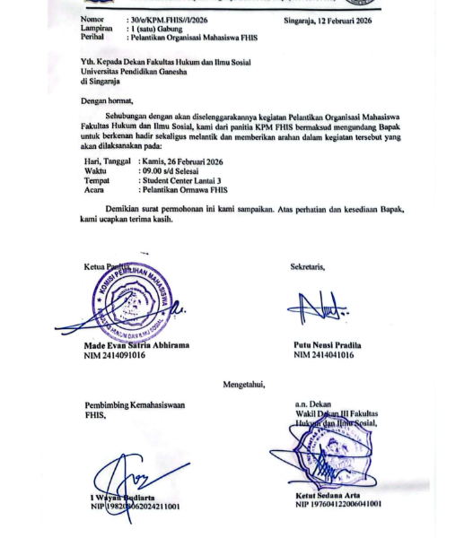 12 Februari 2026 Categories Agenda Tags 13 Undangan Pelantikan Organisasi Mahasiswa FHIS Undiksha sekaligus Memberikan SambutanUnduh Share Related posts23 Maret 2026OFFICIAL ANNOUNCEMENT-CALL FOR PAPERS-Read more26 Februari 2026Informasi Pendaftaran Internship ke Prince of Songkla University, ThailandRead more24 Februari 2026Penyampaian Informasi Open Recruitment pada Kegiatan Jakarta SmartTax 2026Read more19 Februari 2026Surat Undangan Menghadiri Yudisium FHIS Undiksha Periode Februari Gelombang III Tahun 2026Read more