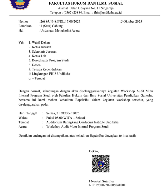 15 Oktober 2025 Categories Agenda Tags Share Related posts13 November 2025“Social Harmony #11”Read more1 November 2025Menghadiri dan Membuka Acara Pembukaan Social Harmony #11Read more1 November 2025Focus Group Discussion dengan tema,“Integritas dan Tanggung Jawab sebagai Pilar Utama Pelayanan Akademik” oleh Fakultas Hukumdan Ilmu Sosial Undiksha,Read more1 November 2025Kuliah Umum Dosen Praktisi Jurusan Hukum dan Kewarganegaraan, Fakultas Hukum dan Ilmu Sosial, Universitas Pendidikan GaneshaRead more