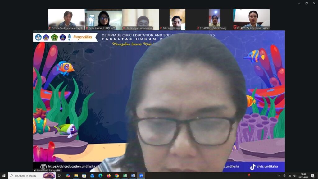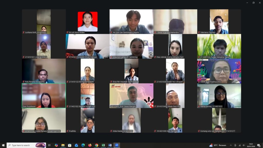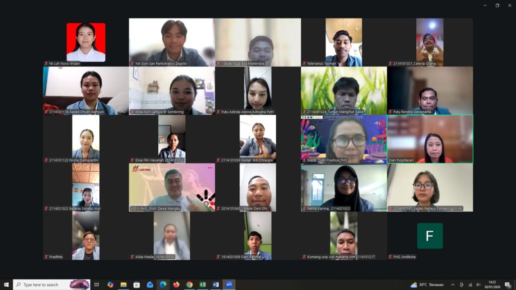Singaraja – Pada hari Jumat (30/01/2026) Fakultas Hukum dan Ilmu Sosial (FHIS) Universitas Pendidikan Ganesha (Undiksha) menyelenggarakan kegiatan Yudisium Periode Januari Tahun 2026. Kegiatan Yudisium FHIS Undiksha Periode Januari Tahun 2026 yang dilaksanakan secara daring ini diikuti sebanyak 21 orang mahasiswa dari beberapa program studi di lingkungan FHIS Undiksha yang telah menyelesaikan studinya dalam periode bulan tersebut.