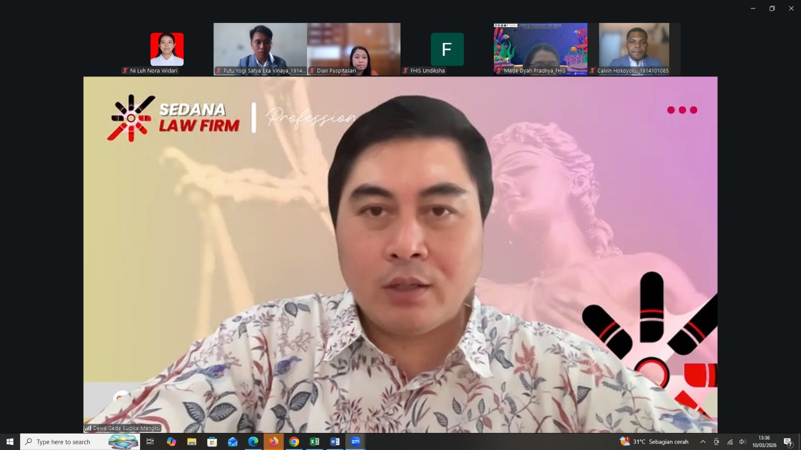 Yudisium FHIS Undiksha Periode Maret Gelombang II Tahun 2026 diawali dengan menyanyikan Lagu Kebangsaan, Indonesia Raya yang kemudian dilanjutkan dengan penyampaian sambutan dari Wakil Dekan I FHIS Undiksha, Prof. Dr. Dewa Gede Sudika Mangku, S.H., LL.M. mewakili Dekan FHIS Undiksha dengan menyampaikan apresiasinya kepada seluruh peserta yudisium karena telah sukses menempuh perkuliahan di FHIS Undiksha. Selanjutnya, Prof. Dewa Gede Sudika Mangku juga menyampaikan arahannya agar seluruh peserta yudisium dapat memperoleh pekerjaan yang sesuai dan menerapkan ilmu-ilmu yang telah diperoleh selama masa perkuliahan serta sukses menempuh pendidikan kembali bagi mahasiswa yang akan melanjutkan studinya. Peserta yudisium juga diharapkan agar memberikan motivasi kepada mahasiswa lainnya agar dapat menyelesaikan perkuliahannya dengan tepat waktu. Selain itu, peserta yudisium turut berpartisipasi dalam mempromosikan FHIS Undiksha. Diakhir sambutannya, Prof. Dewa Gede Sudika Mangku juga menyampaikan permohonan maaf atas kekeliruan baik yang disengaja maupun tidak disengaja oleh dosen maupun tenaga kependidikan di lingkungan FHIS Undiksha.